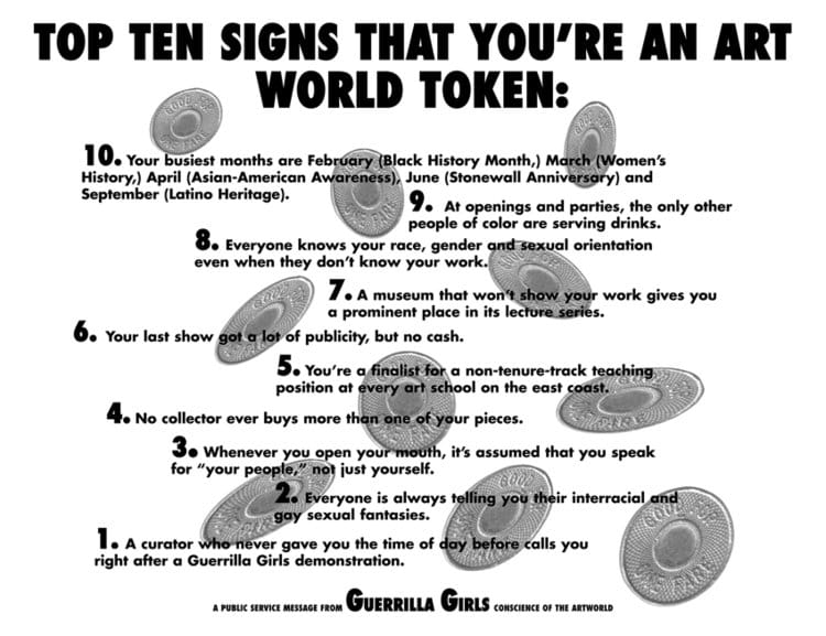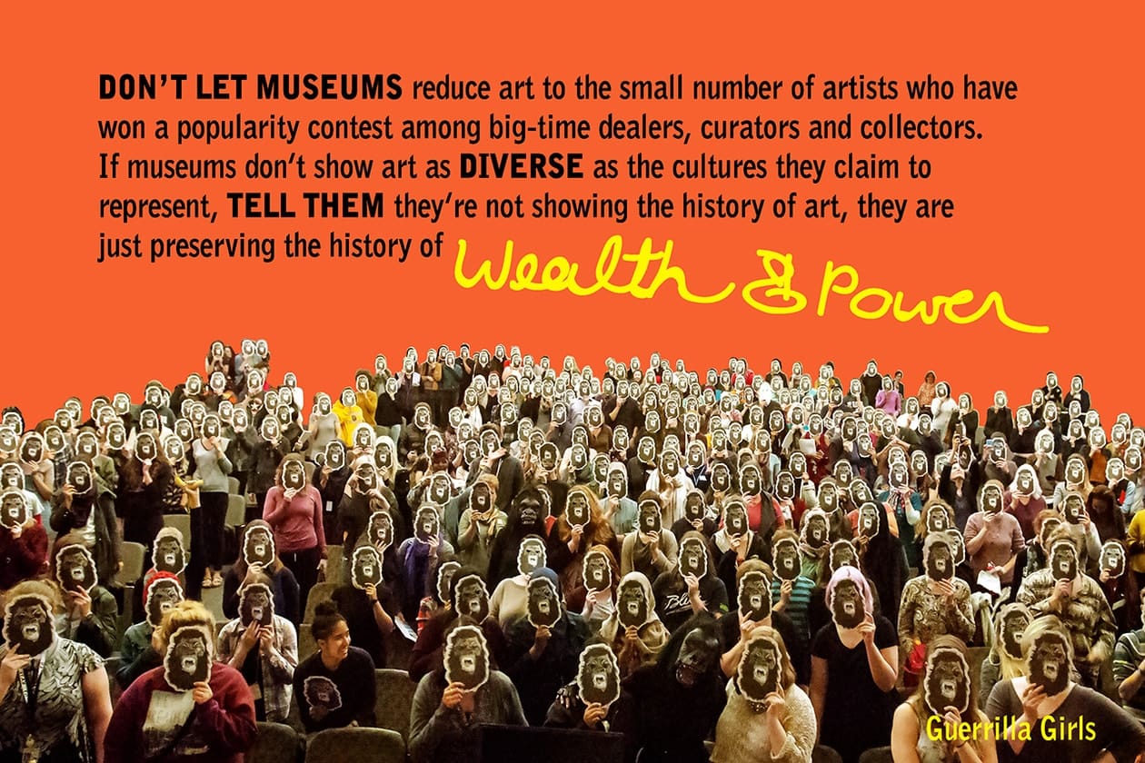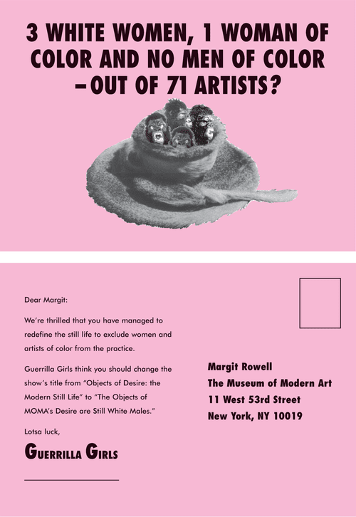 The group emerged in 1985 from a picket against the Museum of Modern Art (MoMA) in NYC and has since tracked the representation of women artists and artists of color in museums and galleries by publicly exposing the discrimination that institutions try to keep hidden, such as the corrupt networks between museum boards, collectors, and galleries, and calling out board members who profit from their positions, mass incarceration, and the war machine.