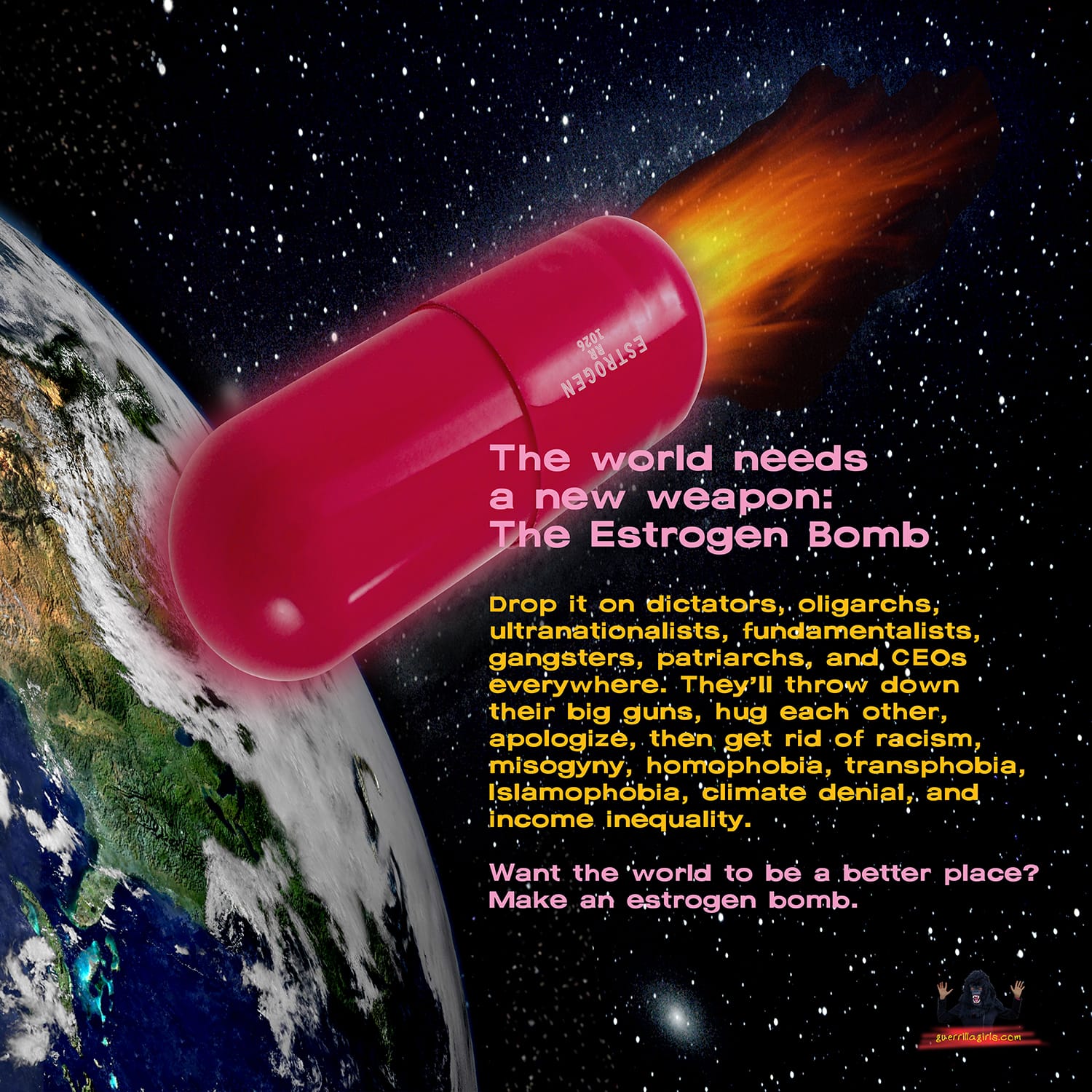 The Guerrilla Girls are an anonymous collective of feminist artists combating sexism and racism within the art world by combining humor, bold graphics, and stark statistics into digestible material such as posters, billboards, campaigns, lectures, and public interventions. Members maintain their anonymity and keep the focus on issues by wearing gorilla masks and using pseudonyms of deceased female artists like Frida Kahlo and Harriet Tubman.
